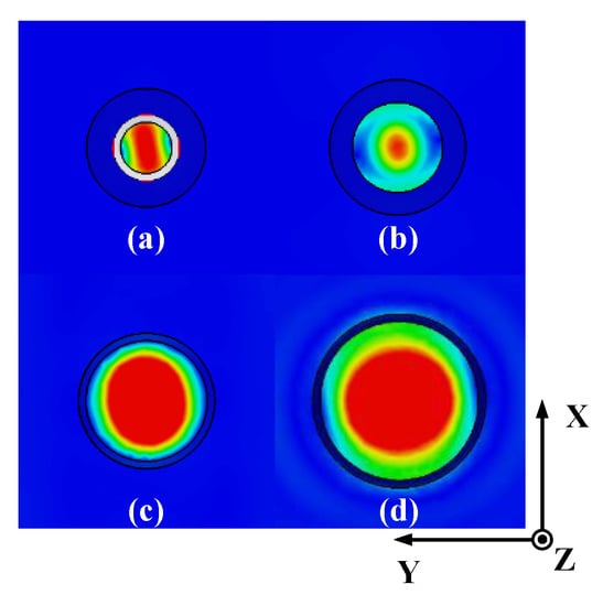 The electric field magnitude at the cross sections inside the optimized horn antenna: (a) inside the circular waveguide, (b) at the first abrupt change part, (c) at the second abrupt change part, and (d) at the flared aperture.