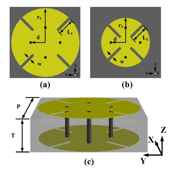 The proposed unit cells with two identical conductive layers printed on the both sides of the substrate and the slots control the changing of transmission coefficients; the whole structure is presented in Figure 4. The material of substrate is Rogers 4003C, which has the dielectric constant (εr) of 3.38 and loss tangent of 0.0027. To get the phase and amplitude of transmission coefficient (S21), CST Microwave Studio is used to simulate the unit cell structure with period boundary condition in X and Y direction and the excitation of the normal plane wave in Z direction. In Figure 4c, the side length of square substrate (P) is 5.3 mm, the thickness (T) of substrate is 1.524 mm, and four vias are inserted in the substrate to connect the upper and bottom metallic layers.