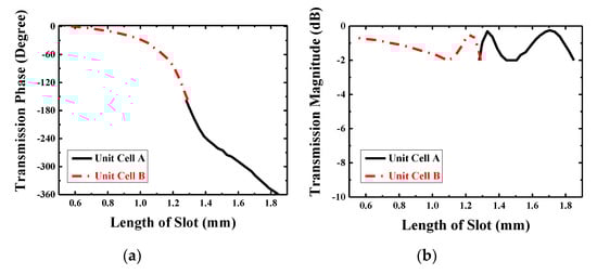 Figure 5 shows that the transmission coefficients change with the length of slots while other parameters remain unchanged in this process. Apparently, in Figure 5a, there is a seamless connection between the phase shift of Unit Cell A and Unit Cell B and the full 360° can be covered with a gentle slope to realize the requirement of focusing effect of transmission wave. The transmission magnitudes are all over −2 dB, which is proposed in Figure 5b, and for the high gain of TA design, design with less transmission loss is desirable; it is also be helpful in the optimization of SLL reduction in the following research of TA antenna.