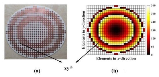 where k is the wave number, Rxy is the distance between the feed position and the center position of xyth element on the array, is the main beam direction, is the position vector of xyth element, and represents the constant phase at the central point of the TA. Equation (1) is worked to calculate all the detailed phase values on the array as showed in Figure 6b. With the approximate functions of the element’s excitation, the radiation pattern can be simplified into the scalar form []: