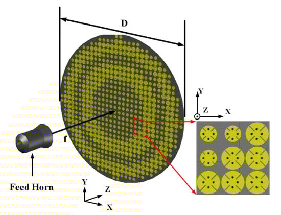 After the optimization of unit cell, we can keep all the transmission coefficient in the level of −2 dB, which is shown in Figure 5b. From that plot, it is obvious that the most part in Unit Cell B has a higher and smoother tendency changing with the length of slots than the magnitude tendency of Unit Cell A. Additionally, according to the first and second approximation discussed before, the farther from the center, the greater the design error may occur. Hence, we should put the elements with less transmission loss around the center as much as possible. In this situation, the Unit Cell B with the length of 1.29 mm (L2 = 1.29 mm) is selected as the four identical elements in the center because of the symmetrical distribution of elements. Other elements are determined based on the relationship between the length of slots and the related phase in Figure 5a; therefore, the distribution of elements with different dimensional information is presented in Figure 6a. Figure 7 presents the positional relation between TA and the feed horn. As described above, D is the diameter of TA, which has the value of 160 mm, and f is the distance from the center of source antenna to the center of TA, and the ratio between f and D (f/D) is an important criterion to judge the SLL and low-profile of a TA antenna. The smaller value of f/D, the better low-profile performance of a TA antenna and the worse of the backward radiation, so there is a tradeoff needed to be made.