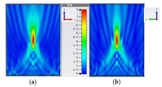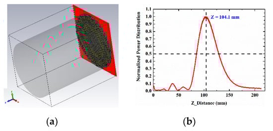 For the working principle, the TA is aimed to imitate the function of lens and the feed source is placed at the virtual focal point. When the quasi-spherical wave emitted by the feed crosses over the TA, it will compensate the phases and form a uniform wave front similar to a plane wave. Reversely, when the TA is illuminated by the plane wave, the wave will gather at one point theoretically just like the optical reversibility in the Fermat’s principle. In this way of analysis, a plane wave is placed at one transmission side of the TA like shown in Figure 8a, and the power density on the E-plane and H-plane of the other TA side will be shown as in Figure 9. Obviously, the energy is focused at an area, and this area is the approximate position to place the feed. The normalized energy distribution along the intersection line of E-plane and H-plane is proposed in Figure 8b. The peak in Figure 8b is the theoretical optimum of the feed position (f) which has a value of 104.1 mm, so the theoretical ratio of f/D will be around 0.65, and slight changing near 0.65 will be needed in the simulation to find the best position of feed. The simulation result is shown in Figure 10, in which the far-field gain of TA antenna is 27 dB at 28 GHz, SLL in E-plane is −19.6 dB and in H-plane is −21.7 dB, and compared with the radiation pattern of horn, the focusing effect of TA is significant in two cut planes.