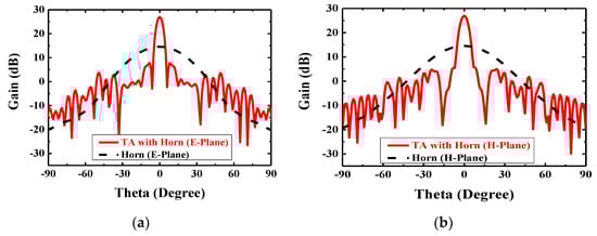 Simulated far-field radiation pattern of feed source and TA antenna in two cut planes at 28 GHz: (a) E-plane comparison and (b) H-plane comparison.