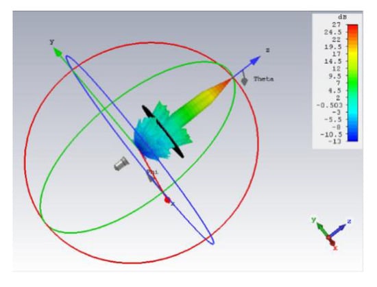 As the simulation of TA antenna established before, it has a gain of 27 dB with the SLL of −20 dB at 28 GHz, and this result is based on the optimized f/D of 0.65, but the position of feed is not the only part that can be optimized in a system of TA antenna. In order to reduce SLL or form multibeams in the desired direction, the phase and magnitude distribution of array can also be optimized [].