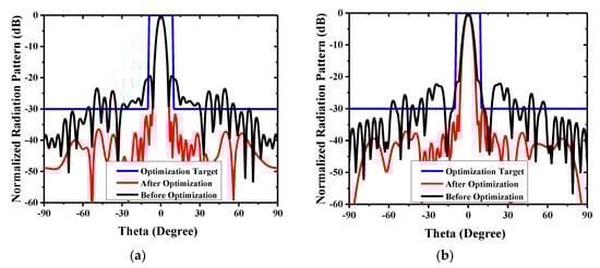 The value of this fitness function is called as the Cost of the optimization, and the lower cost, the closer to the goal of −30 dB SLL. Theoretically, when the Cost equals to zero in the iterations, the optimization finishes completely.