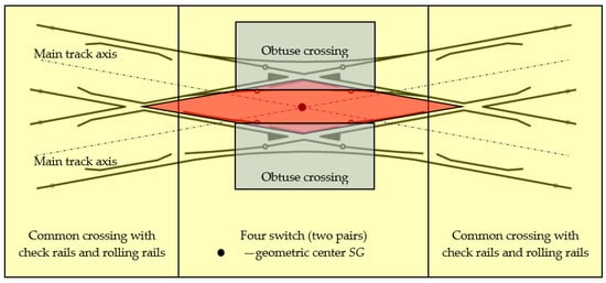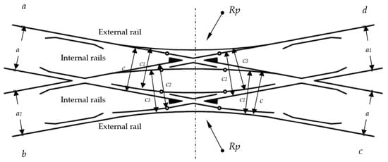Depending on the location of the switches, some turnouts feature blades inside the turnout quadrilateral—a double slip turnout (known as “English”)—while some turnouts feature blades outside the turnout quadrilateral—an outside slip turnout (known as the “Bäseler system” or “shortened English”) [29]. Under the term, a turnout quadrilateral is the area that is contained from the normal to the bisectoral angles of common crossings (at English turnouts), obtuse or triple (at Bäseler system turnouts), carried out by their mathematical points [29]. The double slip turnout—English—is created by building two connections in a diamond crossing in diverted (deviated) directions. This turnout is composed of two common crossings (single crossing), two obtuse crossings, four pairs of switches, and connecting rails (Figure 1).