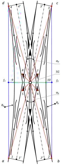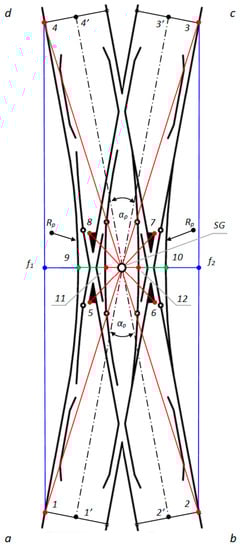 To date, the designation for the geometric location of the center of the Rkpdiwew turnout has only referred to the endpoints of Turnouts 1–4 (Figure 2). However, to correctly determine the geometric center SG, reference should be made to the following (Figure 2):