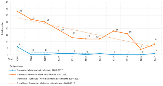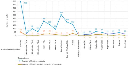 The issue of railway performance and capacity is highly dependent on the state of the infrastructure. Capacity varies depending on factors, such as train speed, the location of stops, train heterogeneity, the distance between train signals, and timetable status. Capacity is an important problem in the railway industry, and the efficient use of infrastructure is a difficult requirement for railway undertakings [42,43,44]. Rail track connections provide the necessary flexibility for the railway network. However, turnouts cause single points of failure and limit capacity [45]. Turnout failures in high-traffic passenger rail systems cause disproportionately long delays. It is recognized that, as equipment failures are eliminated, reliability and availability become contributory factors to a lack of reliability [46].