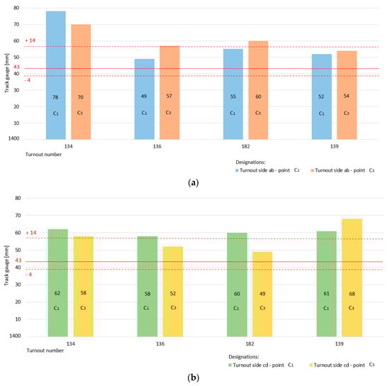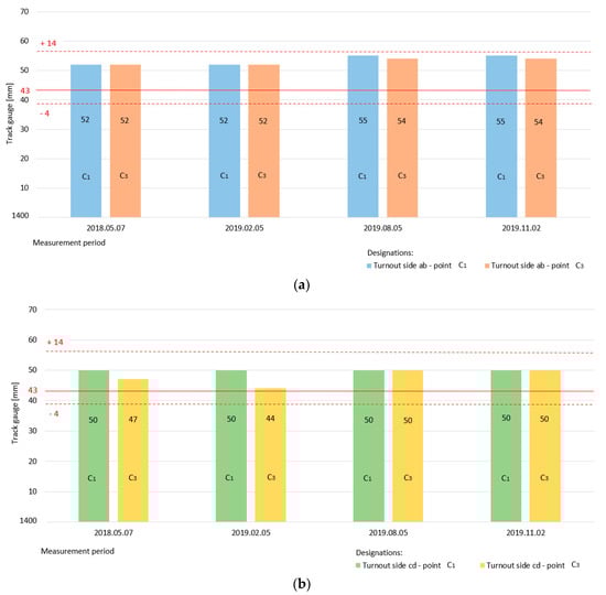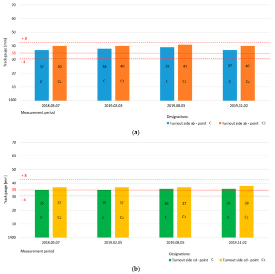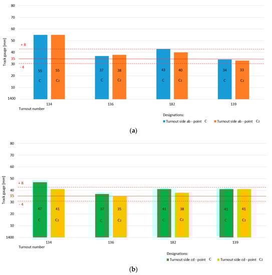 The exploitation speed on the main and diverted tracks of the turnouts covered by the tests was V = 40 km/h, whose acceptable deviations (for track gauge and cant (superelevation parameters)) have already been established.