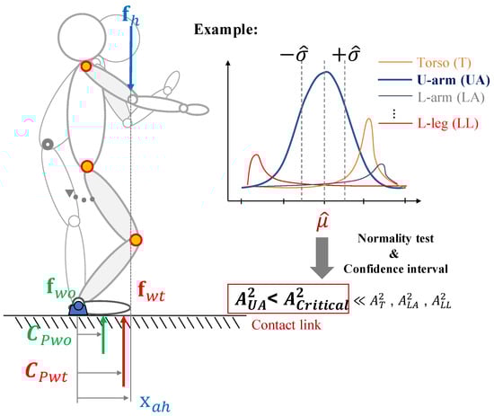 with the Jacobian of the CoP displacement defined as . It should be noted that does not affect the overloading torque vector in any body configuration since the external load effect is included in . By disregarding , the number of human model parameters to be identified can be considerably reduced []. are the distribution gains for vGRF which can be calculated from the body configuration [,] (N.B. is a necessary condition).