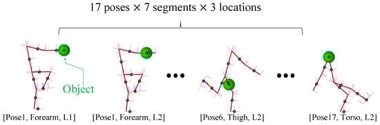 Simulation experiments were destined and developed to evaluate the feasibility of the proposed technique in localisation of the external loads on body links on different body postures. A total of 357 conditions (17 body poses × 7 segments × 3 locations) were simulated to analyse the accuracy of the method in locating the contact points. In fact, these simulations were to understand the expected performance of the proposed technique, prior to the real experiments that revealed the exact performance, as outlined in Section 4.2. The simulation was conducted, as stated above, using Simscape MultibodyTM and integrated using the ode15s solver. Computations were carried out using a personal computer with an Intel core i7, CPU 2.50 GHz processor, 16.0 GB 1600 MHz RAM. The state variables (e.g., joint angles) were collected from a SimMechanicsTM sensing model. On the other hand, and of the human model were obtained by means of four virtual force sensors, which were located at the bottom of the foot link. To consider feasible and realistic human postures, the data to simulate such body configurations were collected through the Xsens MVN Biomech suit. For each body configuration, 3 fixed points on each one of the 7 links (proximal, central, distal) were assumed to be, one by one, the load application point. In Figure 3, a few of these cases are presented as an example.