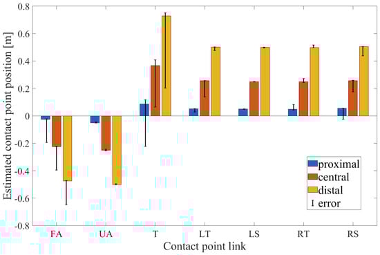 The colored bars represent the mean value among all the simulated body configurations of the contact point computed through the proposed technique, in the proximal (blue), central (orange) and distal (yellow) location on the link, respectively, for each link. The considered links are forearm (FA), upper arm (UA), torso (T), left thigh (LT), left shank (LS), right thigh (RT), right shank (RS). The black line superimposed on the bars represents the maximum and minimum error of the contact point position estimation between all the body configurations. In each condition, the percentage errors between the expected and the computed contact point were calculated and the mean and the standard deviation values, computed among all the contact point positions and body configurations, were obtained for each link. Specifically, the results of such computations are: 17.53% ± 20.56% for the forearm, 0.95% ± 2.71% for the upper arm, 7.18% ± 21.44% for the torso, 2.47% ± 8.98% for the left thigh, 0.62% ± 0.85% for the left shank, 2.32% ± 10.07% for the right thigh and 4.35% ± 14.68% for the right shank, respectively.