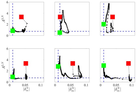 Results of the validation experiment: and , on the y-axis and on the x-axis respectively, computed for subject 1 (first row) and subject 2 (second row), in each experimental condition, for the correspondent contact point link: hands (left column), mid-forearms (middle column) and mid-upper arms (right column).