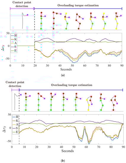 Results of the demonstration experiment to show the application of the proposed contact point detection method in the estimation of joint overloading. For subject 1 (a) and for subjects 2 (b), respectively, the human kinematic and dynamic status in some illustrative instants throughout the experiment (upper graph) and the overloading torques induced by the external load (lower graph) are represented.