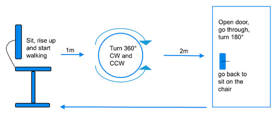 A scheme of the freezing of gait (FOG)-provoking test the participants conducted in the lab [10]. The test was repeated three times, with three different levels of difficulty. From a seated position, the subject walks, turns in a circle clockwise and counter clockwise, as indicated, enters a doorway, turns, and then returns to the seated position. CW, clockwise; CCW, counterclockwise.