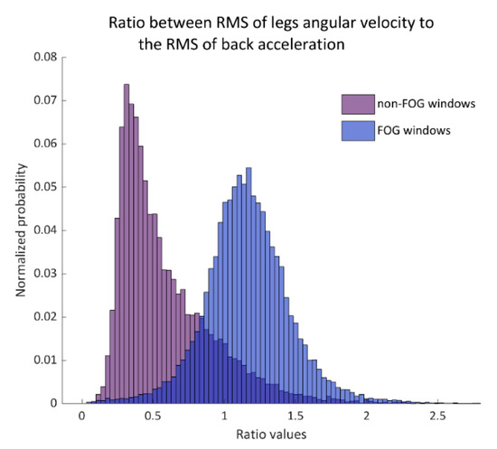The histogram of the ratio between legs gyroscope root-mean-square (RMS) to the back-acceleration RMS in non-FOG windows (left histogram) and FOG windows (right histogram). This ratio was used as a primary input feature to the support vector machines (SVM) model. Probability is shown in normalized values.