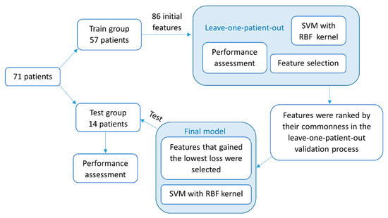 A flowchart of the methodology described in this paper for the detection of FOG episodes with a machine-learning classifier. First described are the feature-selection and -validation processes in a leave-one-patient-out method. Then, the construction and testing of the final model. SVM, support vector machine; RBF, radial basis function.