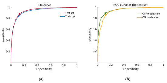 For the final classification model in which the dataset of 57 individuals was trained by the SVM classifier, 14 important features were chosen (Table 3) out of a list of 86 features (Table A1 in the Appendix A). The test set of 14 subjects showed 80.0 ± 19.2% sensitivity, 82.5 ± 11.2% specificity, and 86.6 ± 7.8% accuracy. The AUC of the ROC curve of the test set was 0.94 (see Figure 4a). Figure 4b illustrates ROC curves of the test set separately for the OFF- and ON-medication states. In addition to that, algorithm-derived percent time frozen during the test set was significantly correlated with the annotations-derived percent time frozen (r = 0.897 p < 0.01).