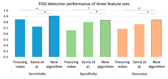 Figure 5 presents the sensitivity, specificity, and accuracy of the freezing index as a single feature and of an SVM with the feature set from Samà et al. [23], as well as the results of the proposed algorithm. As shown in the figure, the proposed algorithm had better accuracy, sensitivity, and specificity compared to the two previously used algorithms.