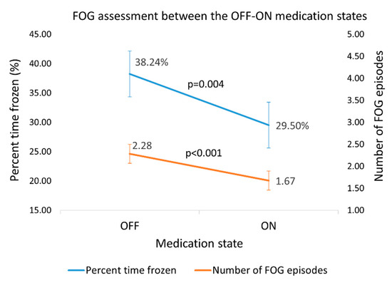 The dataset (71 subjects) was evaluated by the proposed algorithm for the quantity and extent of FOG episodes. As expected, paired t-tests showed that percent time frozen and the number of episodes averaged across the three levels of the test were higher in the OFF state than in the ON state (n = 43 subjects, %FOG: p = 0.004, effect size = 0.5; number of episodes: p < 0.001, effect size = 0.6) (Figure 6). Similarly, the clinical score on the FOG-provoking test increased (p = 0.002) from 4.0 ± 2.2 in the ON state to 5.1 ± 2.3 in the OFF state, with an effect size of 0.5.