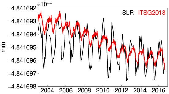 The ITSG-Grace2018 release is based on Level-1B Release 03 data and the AOD1B (Atmosphere and Ocean De-Aliasing Level-1B) Release 06 de-aliasing product. The daily solutions are Kalman smoothed and constrained within the least square adjustment. Therefore, no spatial filtering is necessary for daily solutions [7,23]. To avoid substantial uncertainties, the early beginning and the end period of GRACE is excluded [24]. Thus, the investigated period here is fixed from January 2003 to August 2016. Meanwhile, the maximum degree of this daily model is 40. Since the intra-annual features of the C20 time series of ITSG-Grace2018 are similar to those of the satellite laser ranging (SLR) solution (Figure 1), we do not replace C20 in this work.