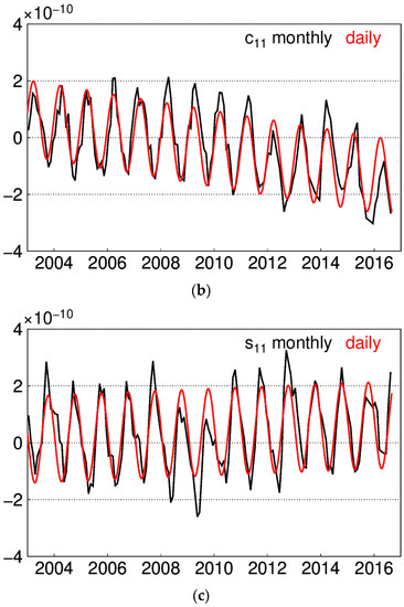 Monthly and daily interpolated degree-1 time series: (a) c10 series; (b) s10 series; (c) s11 series.