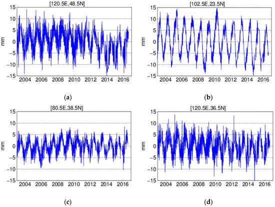 Vertical daily displacement derived from GRACE at four selected grids: (a) at grid (120.5 E, 48.5 N); (b) at grid (102.5 E, 23.5 N); (c) at grid (80.5 E, 38.5 N); (d) at grid (120.5 E, 36.5 N).