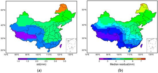 Standard deviations (a) and median (b) of residuals between daily and the monthly average.