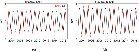 Annual signal extracted with enhanced harmonic analysis (EHA) and least square (LS) at selected grids: (a) at grid (120.5 E, 48.5 N); (b) at grid (102.5 E, 23.5 N); (c) at grid (80.5 E, 38.5 N); (d) at grid (120.5 E, 36.5 N).
