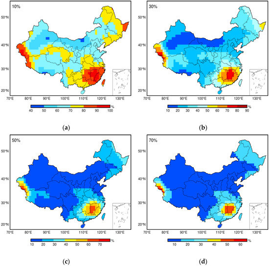 Percentage of epochs for annual signal bias related to LS: (a) larger than 10%; (b) larger than 30%; (c) larger than 50%; and (d) larger than 70%.