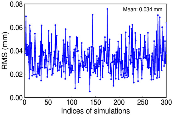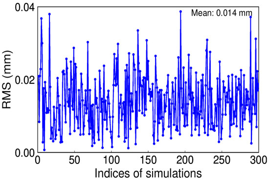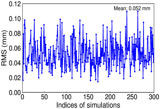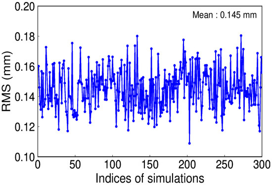 White noise is regarded as the commonly existing noise in time series. To be simple, assume white noise is the only noise and its amplitude is 0.8 mm. We conducted this simulation for 300 trials. Since a constant annual signal is given, the IP number is 1. Figure 8 depicts the RMS distribution, which reveals that the true signal can be effectively recovered by using EHA.