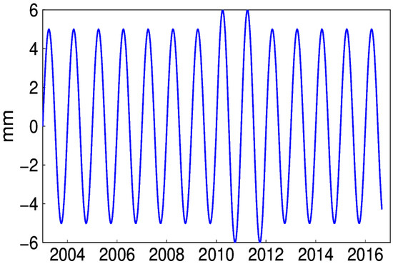 where is the linear trend; for , and are the harmonics for the annual signal (); and for , and are the harmonics for the semi-annual signal (). In this case, for annual signal, the amplitude is represented as , which is unchanged with time. Through LS, the linear and the seasonal signal of constant amplitudes can be obtained. While in fact, the parameters to estimate in Equation (3) are related with time; to be more rigorous, they should be expressed as: