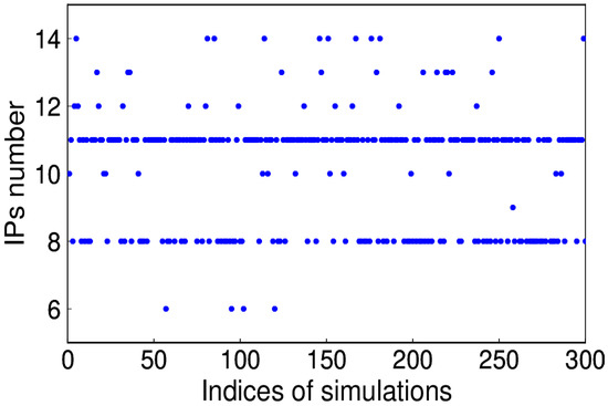 The simulated annual signal is shown in Figure 11, of which the amplitude is larger during the period from 2010 to 2011. Given the known signal in simulations, the number of IPs is determined on the criterion of minimum RMS of the extracted and simulated signal (see Figure 12). The corresponding IPs of the 300 simulations are presented in Figure 13. We can see that 8 and 11 account for a large proportion, that is, 30% and 52.3%, respectively. However, in fact, the above minimum RMS criterion to get the accurate IPs is not practicable, since the true signal is not known. Therefore, whether the bias of IPs causes substantial discrepancies is the question to address. Taking one simulation of which the optimal IPs is 11 for example, the IP ranges from 8 to 14 are tested. It is apparent that in Figure 14, the RMS differences exist, which is much lower than the amplitude of noise simulated.