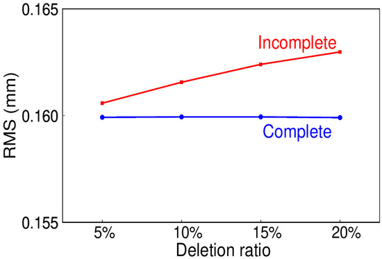 Due to various reasons such as physical disturbance, equipment failure, or maintenance, missing data occasionally happen, which leads to the data being incomplete. In this test, randomly deletion of the simulations at the rate of 5%, 10%, 15%, and 20% are generated, and to get a comprehensive evaluation, 300 trials for each are carried out. The comparisons of complete and incomplete data are necessary. The mean RMS for the signal extracted and simulated is shown in Figure 15, the blue line represents the complete data, while the red one represents the incomplete data. It can be seen that as the data deletion ratio increases, the mean RMS increases. However, the relative percentage of mean RMS ranges from 0.4% to 1.9%, which could be neglected even as the deletion ratio reaches 20%. Meanwhile, for the daily ITSG-Grace2018 model, the days with insufficient observations are often regarded as the missing ones. The two longest continuous missing periods even last for two months, that is, from 1st August to 30th September 2013 and from 1st May to 30th June 2015, which is the representative experiment of the same missing data as the real data. The RMS for the complete and incomplete data is 0.163 and 0.176 mm, with the relative percentage of 7.9%. This confirms that EHA can deal with the missing data without interpolation beforehand, even for the continuously missing data.