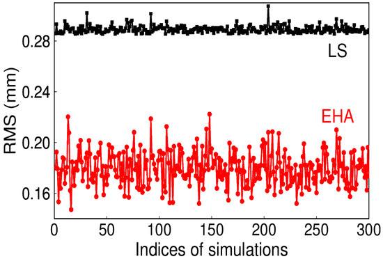 Actually, geodetic time series are synthesized with more than one harmonic signal, which is also evident in the frequency analysis [13]. The performance of EHA on obtaining a true signal from the simultaneous periodic signal is also tested. The time-varying semi-annual signals (in black) as well as its synthetic annual signal (in red) are shown in Figure 16. Since traditional LS cannot distinguish the time-varying signals, the RMS of LS is higher than that of EHA (see Figure 17). Therefore, EHA demonstrates its distinct advantage over LS. In addition, the mean RMS of 300 simulations for EHA is 0.18 mm, which indicates that the simultaneous signal extracted is close to the synthetic.