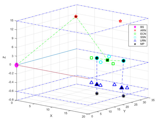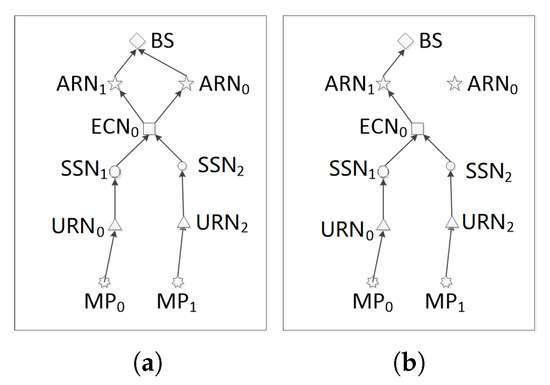 In the HMMN-EC, the BS is the destination node; ARNs, ECNs, SSNs, and URNs are the intermediate nodes; and MPs are source nodes. All nodes are organized hierarchically within the communication radius of nodes, and an efficient tree architecture will finally be formed to achieve an effective communication.