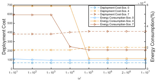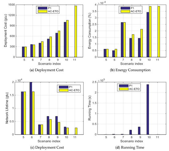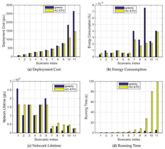 As shown in Figure 8a, the deployment cost of AC-ETO is lower than that of the greedy algorithm. In Figure 8b, it is found that the energy consumption of the greedy algorithm in different scenarios is higher than that of AC-ETO. Accordingly, the network lifetime of AC-ETO is longer than that of the greedy algorithm in Figure 8c. In the greedy algorithm, it is favorable to select a path with the minimum cost and, accordingly, the minimum energy consumption, which does not guarantee the cost and energy consumption of the overall network. While AC-ETO guides ants to find the optimal (approximate optimal) solution through two pheromones. Figure 8d shows that running time increases with the network size. For instance, in Scenario 7, the deployment cost obtained by AC-ETO is 447 gcu while the deployment cost obtained by greedy algorithm is 841 gcu, and the energy consumption obtained by AC-ETO is 5% less than that obtained by greedy algorithm. Thus, AC-ETO achieves better performance than that of the greedy algorithm in different scenarios, at the cost of increased but affordable time complexity.