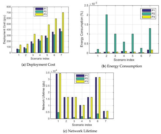 We then compare the solutions of the MO problem (P1) with each of the subproblems of MO, i.e., to minimize the cost (P2) or to minimize the energy consumption (P3) under different scenarios from scenario 1 to 7. The results are compared in Figure 5. As shown in Figure 5a, the deployment cost of P1 is slightly greater than that of P2, but smaller than that of P3. Figure 5b shows that the energy consumption of P1 is similar to that of P3, but much smaller than that of P2. Correspondingly, the network lifetime of P1 is much greater than that of P2, while smaller-than or equal-to that of P3, as shown in Figure 5c. Thus, using P1, a longer network lifetime can be achieved with a lower deployment cost. Again, Gurobi can achieve the optimal solution.