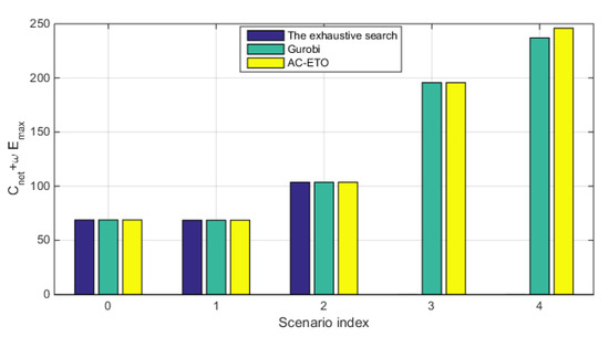 Based on the above process, a series of small-scale network simulation are carried out to verify the performance of the algorithm and compare it with the exhaustive search and Gurobi. As shown in Figure 6, the results of the proposed algorithm in Scenarios 0–2 approaches that of the exhaustive search and Gurobi. For instance, the optimal solution of the AC-ETO in Scenario 0 is 68.818, which equals to that of the exhaustive search. Thus, the solutions of the algorithm in small-scale networks are close to optimal. As the scale of the network increase, it is difficult to obtain the optimal solutions by the exhaustive search. We further compare the solutions of the algorithm with that of the Gurobi in Scenarios 3–4. Figure 6 shows that the results of the algorithm is very close to that of gurobi. Therefore, the optimization solution of the AC-ETO are close to optimal in small-scale and medium-scale networks.