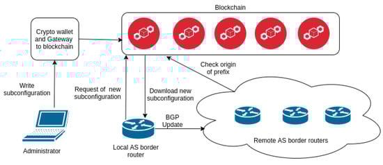 The whole architecture is shown in Figure 2. Our design connects the two modules. The one describes how to distribute configuration file securely into the router over the blockchain network. The second architecture proposes a reliable way for authentication assigned BGP sources against IP prefix hijacking. Although, if the border router receives BGP update message from a neighbour, it verifies Route Origin Authorisation (ROA) information in blockchain for every IP prefix. This solution protects us against accepting unauthorized IP prefixes, which might be used in IP prefix hijacking. However, it does not any inhibit the spread of these IP prefixes. Therefore, we introduce the architecture focused on adverting only authorized prefixes in BGP update messages by routers. We propose the following solution: the router downloads IP prefixes from the blockchain network which it inserts into an update message. Before this step, the administrator must upload a list of IP prefixes for the router. Nodes in blockchain subsequently verify it. Also, it checks if there is the valid entry stored in blockchain for every prefix of the list. This architecture includes only prefixes that are verified to be assigned to the AS of the router. Thus, routers add to their configuration only valid IP prefixes from the blockchain network and will advertise through BGP only legitimate information. This approach protects against administrator accidental misconfiguration or malicious appropriation of IP prefix of other AS. Nevertheless, it does not affect the dissemination of prefixes that have been learned from neighbouring ASes.