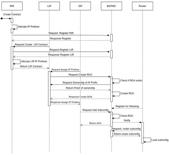 We first researched the process of allocating and assigning BGP resources with RPKI. On base this process, we found out how to correctly interpret relationships between our smart contracts. Three virtual machines with OS Ubuntu Server 20.04 LTS [20] created our test environment. Each of these virtual machines represented one of the participants, such as RIR, LIR and ISP. These virtual machines were deployed in various geographical locations. We created scripts for each participant. One for the RIRs is used for the assignment of the IP prefixes and for creating the LIR smart contract. LIR script was made for creating and removing ROA entries. Finally, there is an ISP script that manages subconfigurations of the routers.