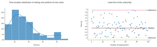 The second scenario was performed by making 100 measurements of time used to apply a new subconfiguration onto the ISP router. It is the duration of uploading a new subconfiguration to downloading load the new subconfiguration to the router. The duration average of this operation is 37.5 s. The minimal time of setting subconfiguration is 23 s. The maximum observed time is 64 s, and the median value is 34.7 s. Figure 6 depicts the results, with the distribution graph of measured values on the left side. The graph of duration time of downloading and loading the subconfiguration is shown on the right.
