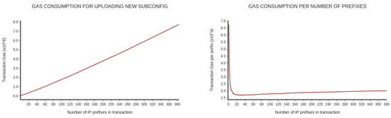 The third scenario examines the gas consumption. The gas unit measures the amount of work required to perform a specific operation on the network. The unit of gas is paid in Gwei. The term Gwei refers to a small denomination of Ethereum which can be an analogy with cents in the Euro [21]. We assume that if we increase the number of prefixes in one transaction, the transaction cost will rise. Figure 7 displays the gas consumption related to the number of prefixes grouped into one transaction. The graphs represent the gas unit’s consumption per one transaction and one prefix, respectively.