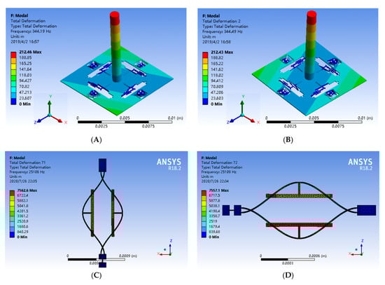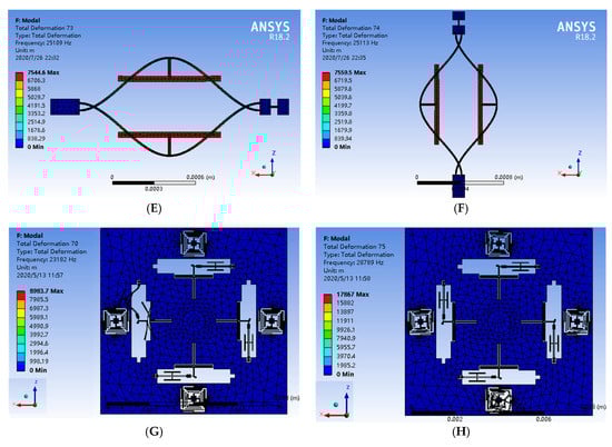 The mode simulation is utilized to evaluate the mode shapes and natural frequencies of the proposed structure. The effective working modes of the proposed sensor are shown in Figure 2 and the natural frequencies of effective modes are listed in Table 2. As illustrated in Figure 2A,B, the first and second modes of the device are designed as the sense modes, and the mode frequencies are 344.19 Hz and 344.49 Hz, respectively. It is obvious that the sense mode frequencies are relatively low, which is conducive to improving the mechanical sensitivity. The frequency difference of the first and second modes can be attributed to the asymmetry of structure meshing and simulation calculation error. Similarly, there is a certain error in the simulation of the frequencies of resonators. The interference mode means the invalid mode. The interference mode is not stimulated when the device is working. Due to the better damping characteristics of DETFs, the anti-phase mode is selected as the operation mode of DETFs. The resonant beams of DETFs have identical vibration amplitudes and the opposite movement direction in the anti-phase mode. The natural frequencies of the four resonators in the anti-phase mode are 25,106 Hz, 25,108 Hz, 25,109 Hz and 25,113 Hz respectively, as shown in Figure 2C–F. Additionally, the natural frequencies of the interference modes are 23,182 Hz and 28,789 Hz, respectively, as show in Figure 2G,H. The minimum frequency difference between the resonant operating mode and the interference mode is 1924 Hz and 3676 Hz, therefore, the simulation results confirm that the effective modes and the interference modes are effectively isolated.