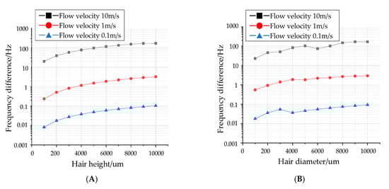 Influence of hair parameters on input and output characteristics. (A) Relationship between hair height and output frequency at different flow velocities. (B) Relationship between hair diameter and output frequency at different velocities.