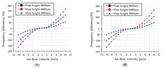The relationship between output frequency and flow velocity at three different hair heights are shown in Figure 4. For the x-axis input air flow, the corresponding sensitivities are 0.59 Hz/(m/s)2, 1.16 Hz/(m/s)2 and 1.69 Hz/(m/s)2 with a hair height of 3000 µm, 6000 µm and 9000 µm. Similarly, the corresponding sensitivities are 0.53 Hz/(m/s)2, 1.07 Hz/(m/s)2 and 1.64 Hz/(m/s)2 for the y-axis input air flow. The results also confirm that the output frequency difference is positively correlated with the square of the air flow velocity, which is also consistent with the theoretical analysis results.