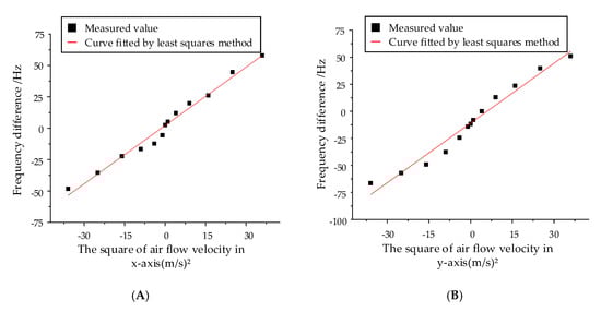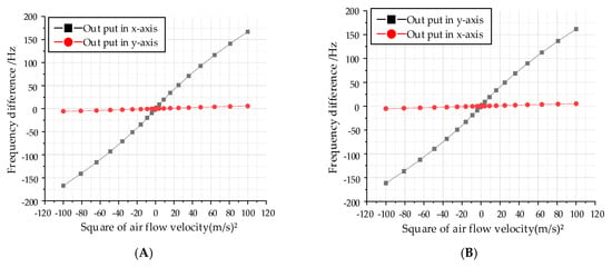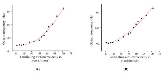 Relationship between output frequency and air flow velocity. (A) Output frequency difference in x-axis. (B) Output frequency difference in y-axis.