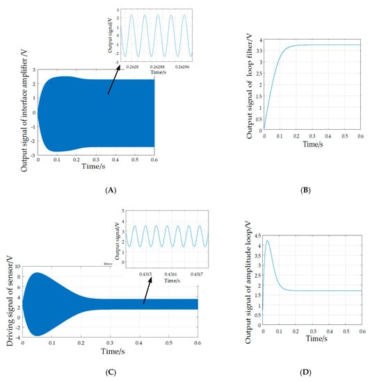 Waveforms of key signals. (A) Output of interface amplifier. (B) Output signal of loop filter. (C) Driving signal of sensor. (D) Output signal of amplitude loop.