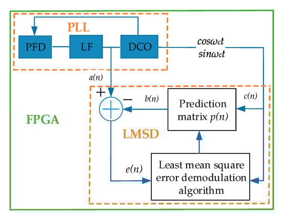 When the proposed hair sensor is arranged in the oscillatory air flow, the frequency difference of the DETFs is also an alternating current signal that requires a specific demodulation scheme [12]. In this paper, a demodulation approach based on the minimization criterion of the mean square error is proposed to extract the effective signal from the noise signal, as shown in Figure 8. The criterion parameters of the mean square error can be automatically adjusted according to the characteristics of the input signal to meet the requirements of the optimal filtering criterion. The error algorithm of the minimum mean square greatly simplifies the complexity of the calculation since the auto-correlation matrix inversion calculation is not necessary. Therefore, the error algorithm of the minimum mean square is utilized to demodulate the oscillatory air flow. After filtering the direct current in the signal, the input signal a(n) of the oscillatory air flow with noise is obtained. The predicted vector p(n) is multiplied by the reference signal c(n) to obtain the predicted signal b(n), and c(n) is an orthogonal digital reference signal, which is directly generated by the coordinate rotation digital computer (CORDIC) algorithm. The variable e(n) is the difference between the input signal a(n) and the predicted signal b(n), and its mean square value is minimized through continuous iteration in the criterion, which makes a(n) closer to b(n) [31]. Hence, the input oscillatory signal is finally demodulated.