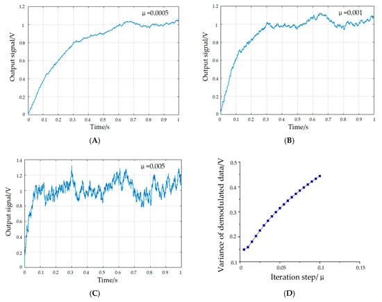 Amplitude curves of demodulation signals. (A) μ = 0.0005. (B) μ = 0.001. (C) μ = 0.005. (D) Effect of iteration step on convergence precision.